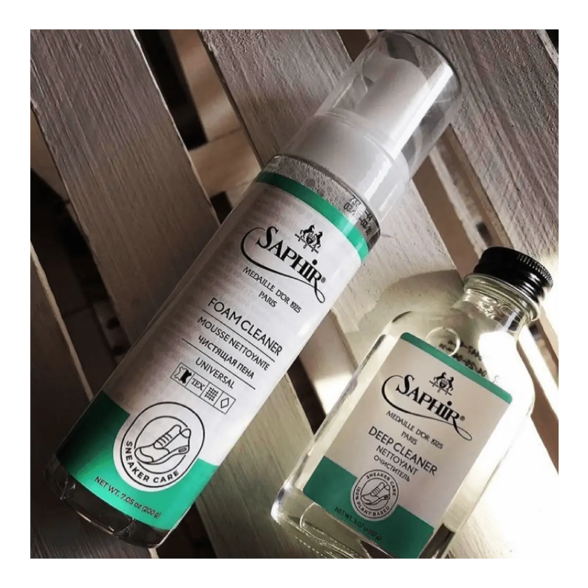 - Apply the deep cleaning cleaner to the dirty areas of the sneakers with a brush or using the special Saphir Medaille D’Or microfiber cleaning cloth.