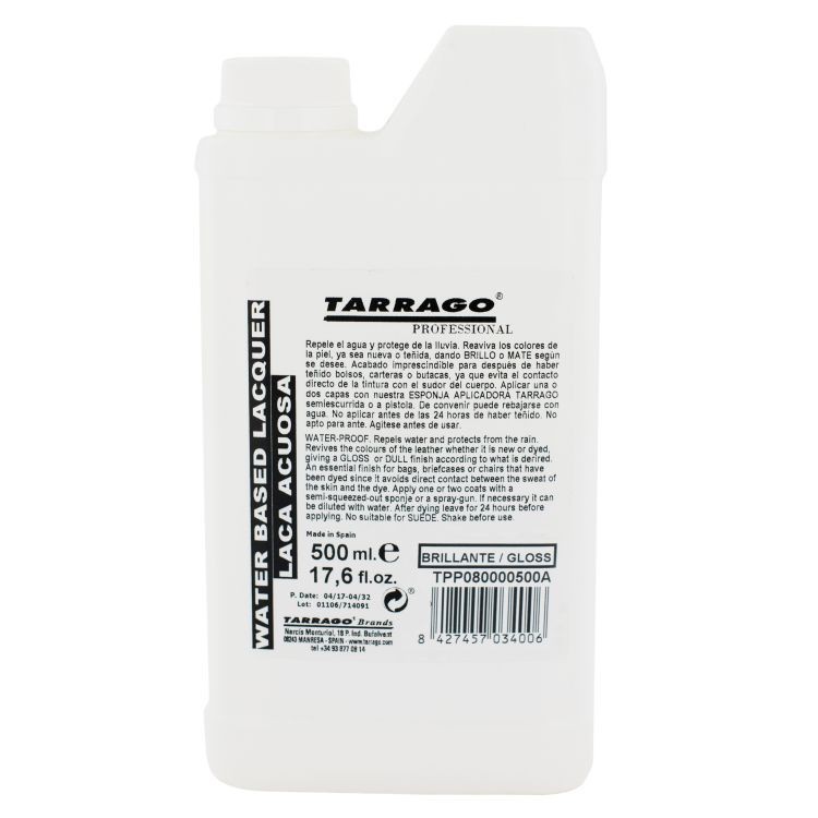 La laque aqueuse Tarrago est une solution particulièrement adaptée à la finition des vêtements en cuir ou des tissus d'ameublement teints avec des colorants à base d'alcool et la teinture universelle Tarrago. Il ravive les couleurs, adoucit le toucher du cuir et améliore sa résistance au frottement, à l'abrasion et à la lumière du soleil, sans jaunir ni noircir.